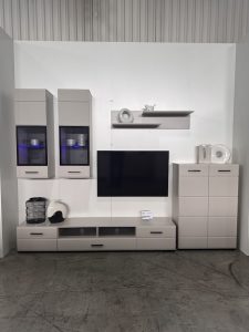 Це один з небагатьох бюджетних варіантів, який не виглядає таким. Контраст, пропорції, підсвітка – все виглядає дорого. Це дуже влучний сучасний варіант меблів для вітальні.