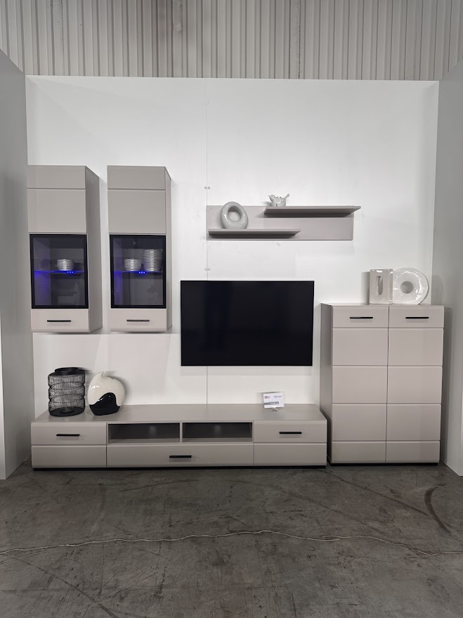 Стінка продається тільки комплектом. Корпус виготовляється з міцного ЛДСП класу Е1. Фасади глянцеві МДФ в білосніжному кольорі. Скляні полиці вітрин обладнані сучасною LED підсвіткою. Фурнітура досить високої якості. Дверцята відкриваються та закриваються за допомогою сучасних пружинних завіс. Нажаль шухлядок в цій стінці немає тому про направляючі говорити недоречно. Нижні дверцята горизонтального відкриття, фіксуються спеціальними механічними обмежувачами.