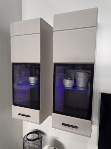 Навісні вітрини мають по дві полиці. Одна з них закрита — ЛДСП, інша відкрита — скляна. Кожна така поличка оснащена підсвіткою. Таке підсвічування має спеціальне пластикове кріплення тому легко фіксується. Підсвітка поставляється з усім необхідним — блок живлення, гніздо для підключення, кнопка керування. Підсвітка поставляється в окремій коробці.