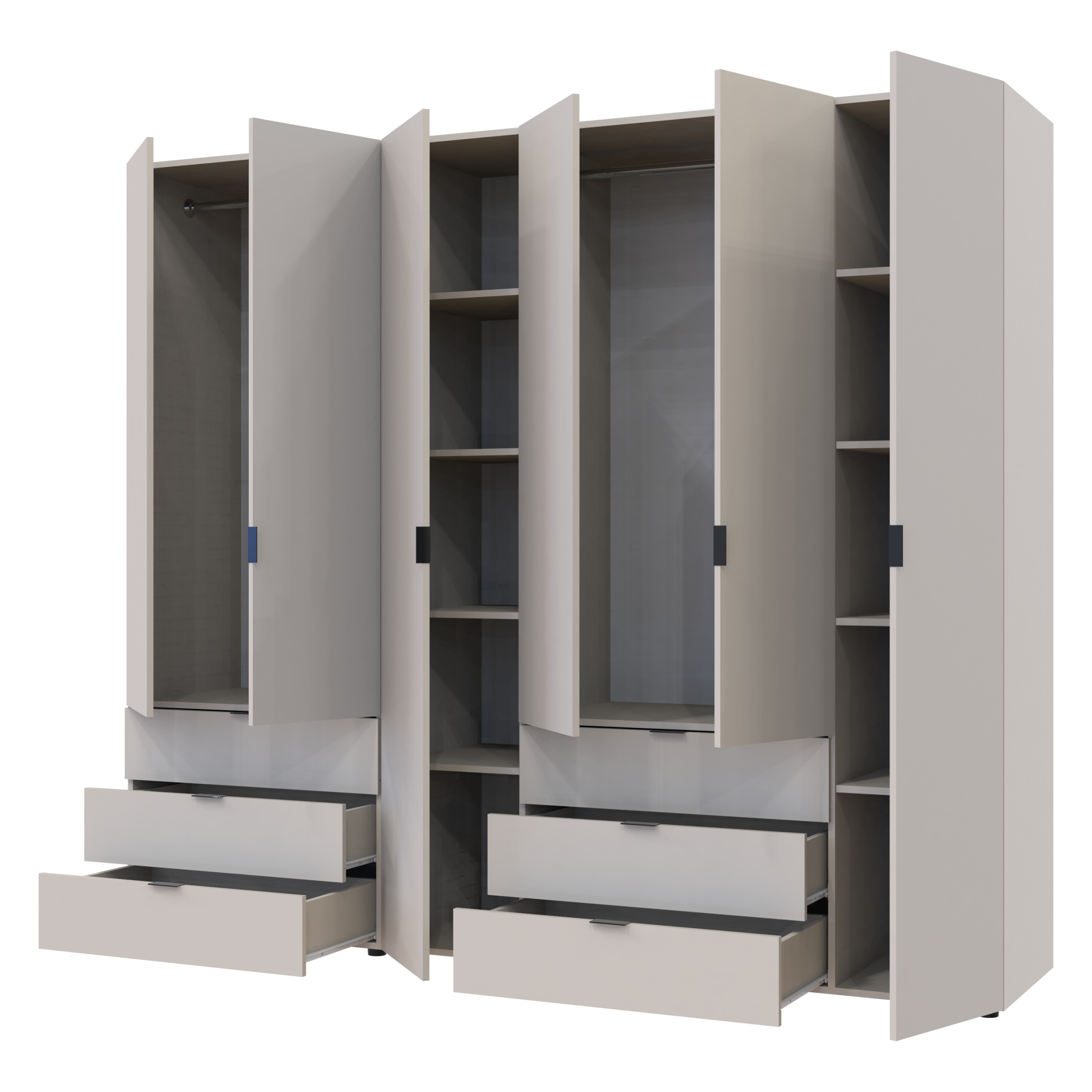 Шафа має два основні відділення та чотири додаткові секції з дверцятами, що формують загальний шестидверний формат з кількома зонами зберігання.