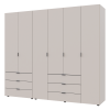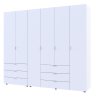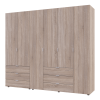 Шестидверна шафа для одягу Гелар Doros 2+4 ДСП призначена для зберігання великого обсягу речей у спальні або гардеробній зоні. Конфігурація поєднує кілька відділень для одягу на вішалках, полиці для складених речей та шухляди для білизни й аксесуарів. Такий формат зручний для сімейного користування, коли потрібен чітко поділений внутрішній простір.