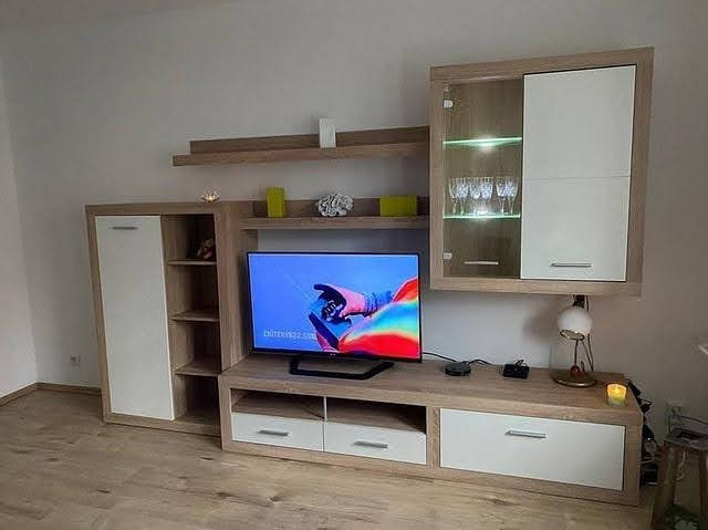 Стінка Орлеанс складається з чотирьох секцій. З ліва тумба-комод, яка поділена полицями та закривається двома дверцятами. За нею тумба під телевізор. Вона досить простора та вміщує сучасні, великі телевізори. Над ТВ-тумбою полиці для книг. Завершує композицію вмістима навісна тумба.