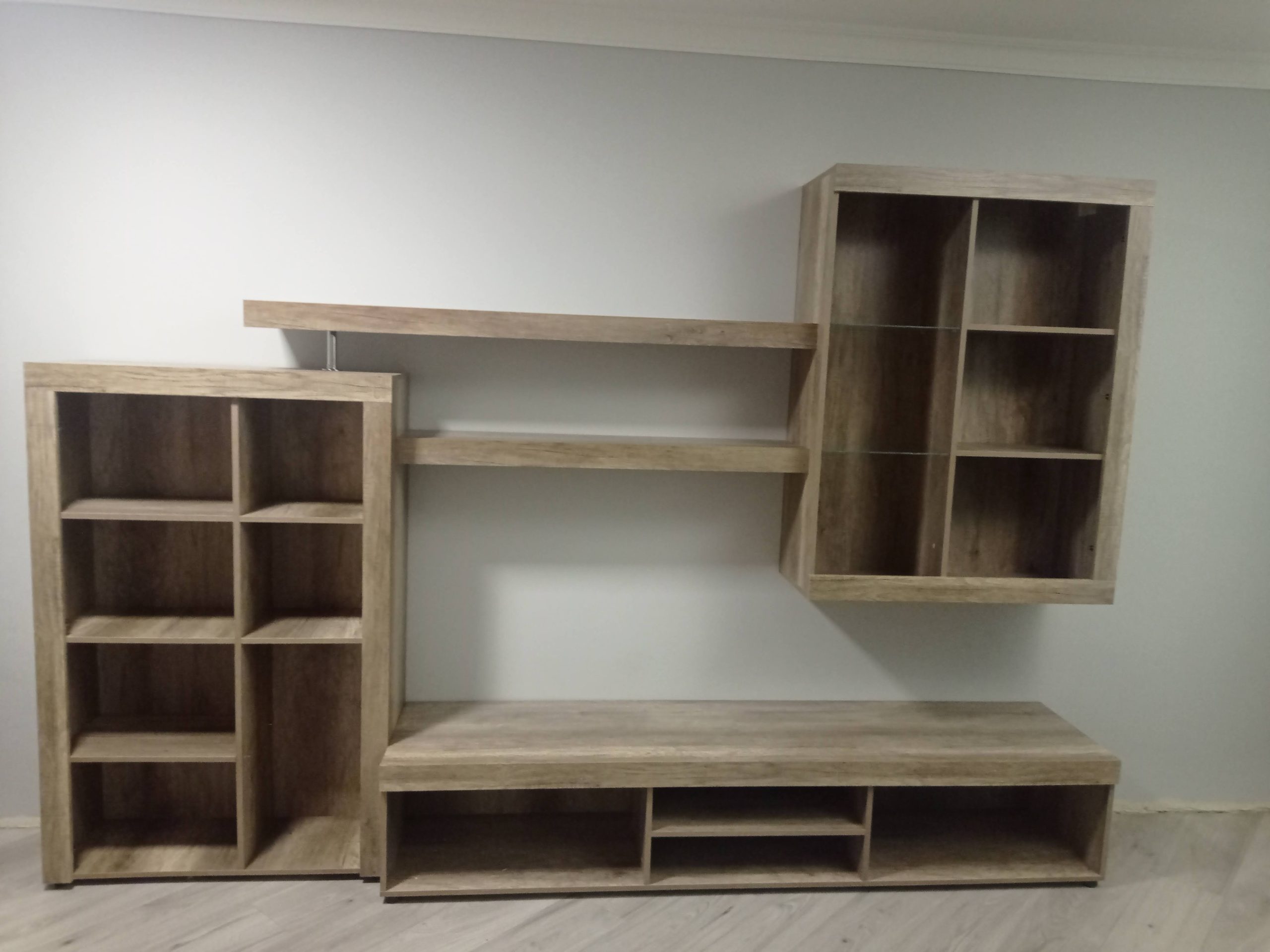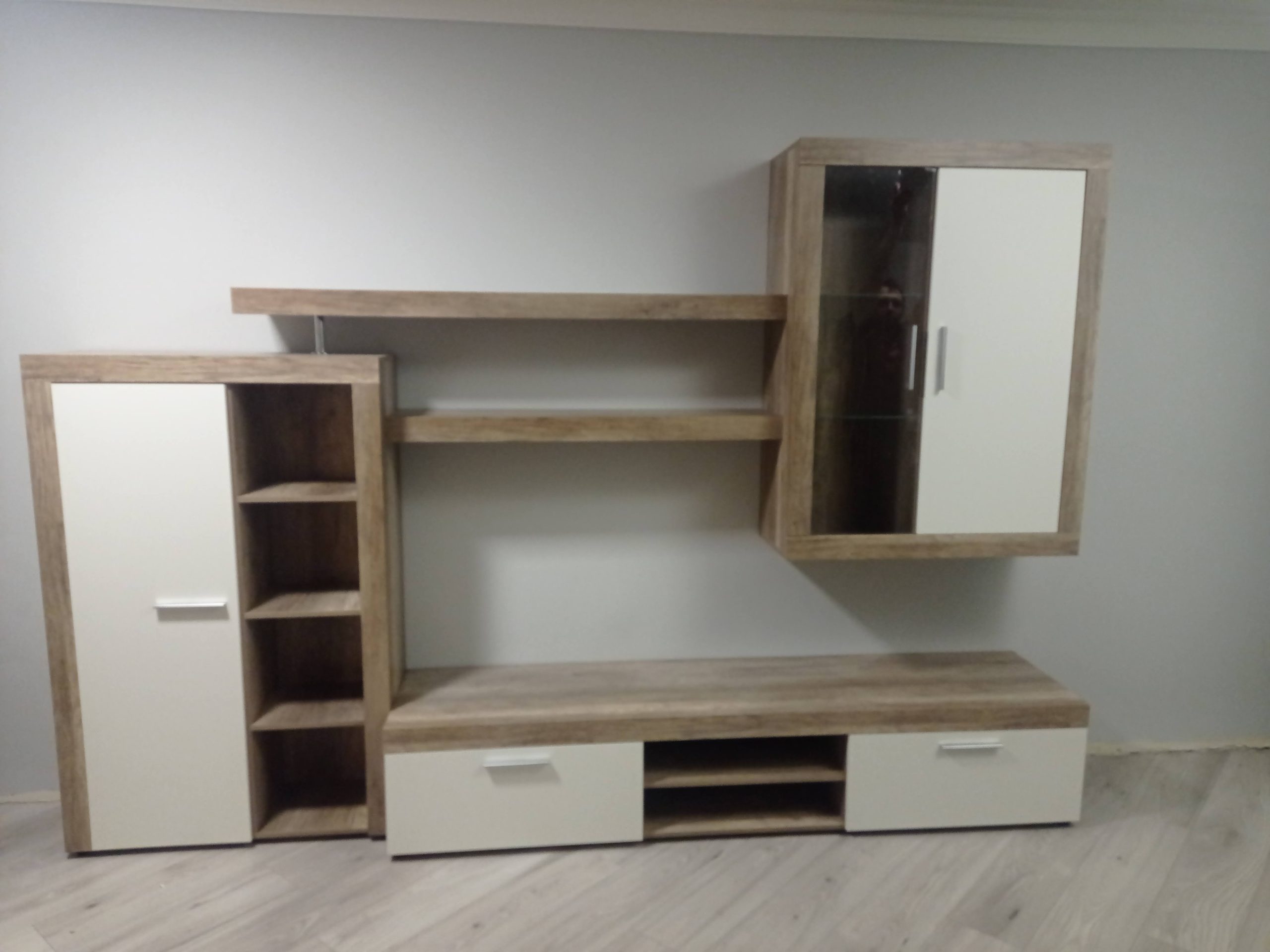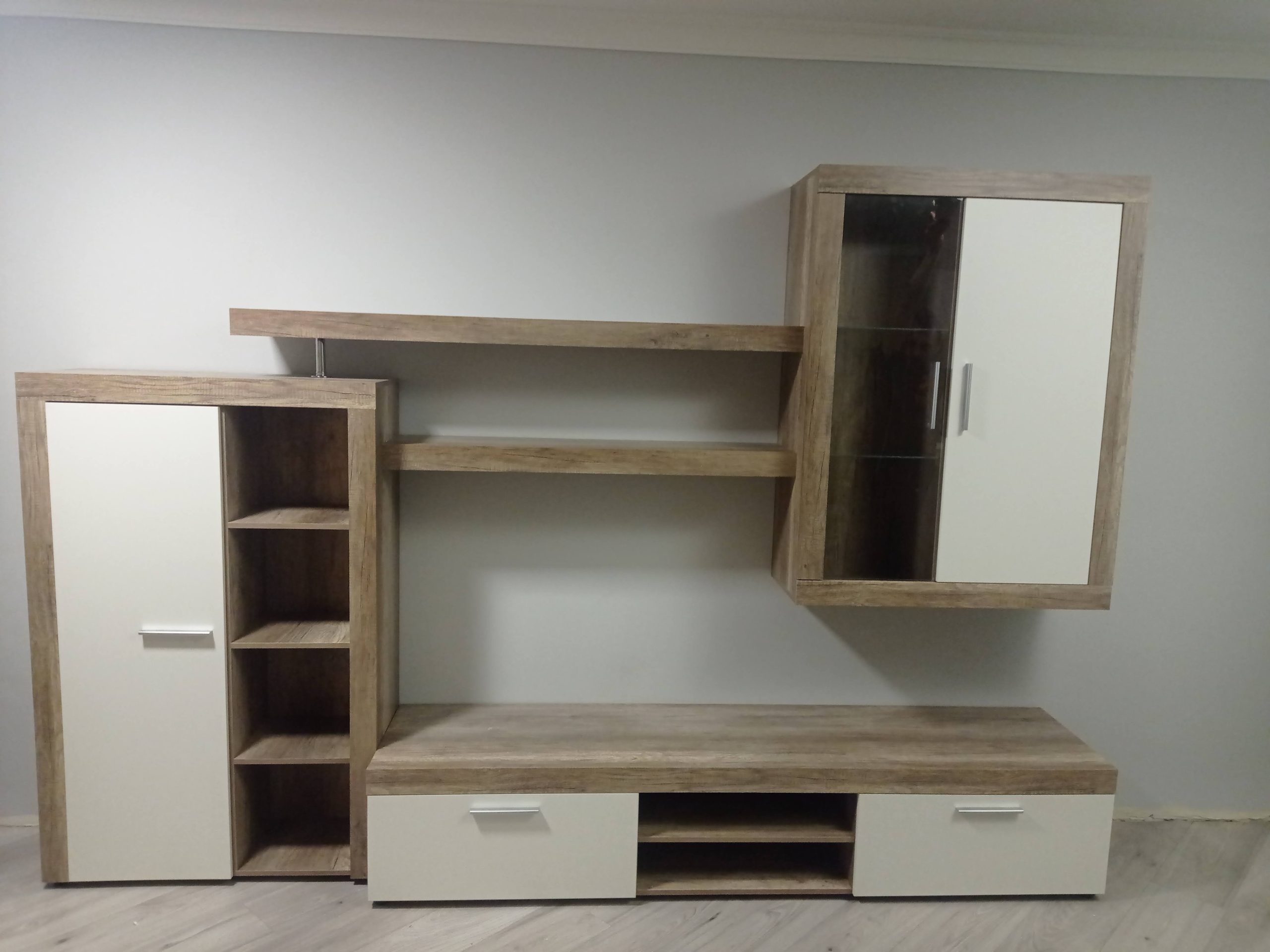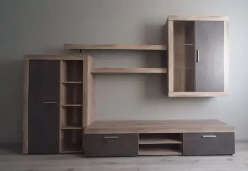 На відміну від інших сучасних меблів цю вітальню легше назвати стаціонарною ніж модульною. Справа в тому, що виробник зробив її так що всі елементи мусять бути розміщені так як на фото. Права верхня тумба кріпиться на стіну, відповідно всі інші підлаштовуються під неї.
