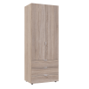 Дводверна шафа-гардероб Гелар Doros 2 ДСП — практичне рішення для зберігання одягу в спальнях, передпокоях або дитячих кімнатах. Усередині передбачено штангу для вішалок і три висувні шухляди для дрібних речей, що дозволяє організувати одяг і аксесуари без зайвого безладу. Каркас і фасади виготовлені з ламінованої ДСП, що забезпечує довговічність і простоту догляду. Напрямні в шухлядах роликові, а шафа обладнана регульованими ніжками для вирівнювання на нерівній підлозі.
